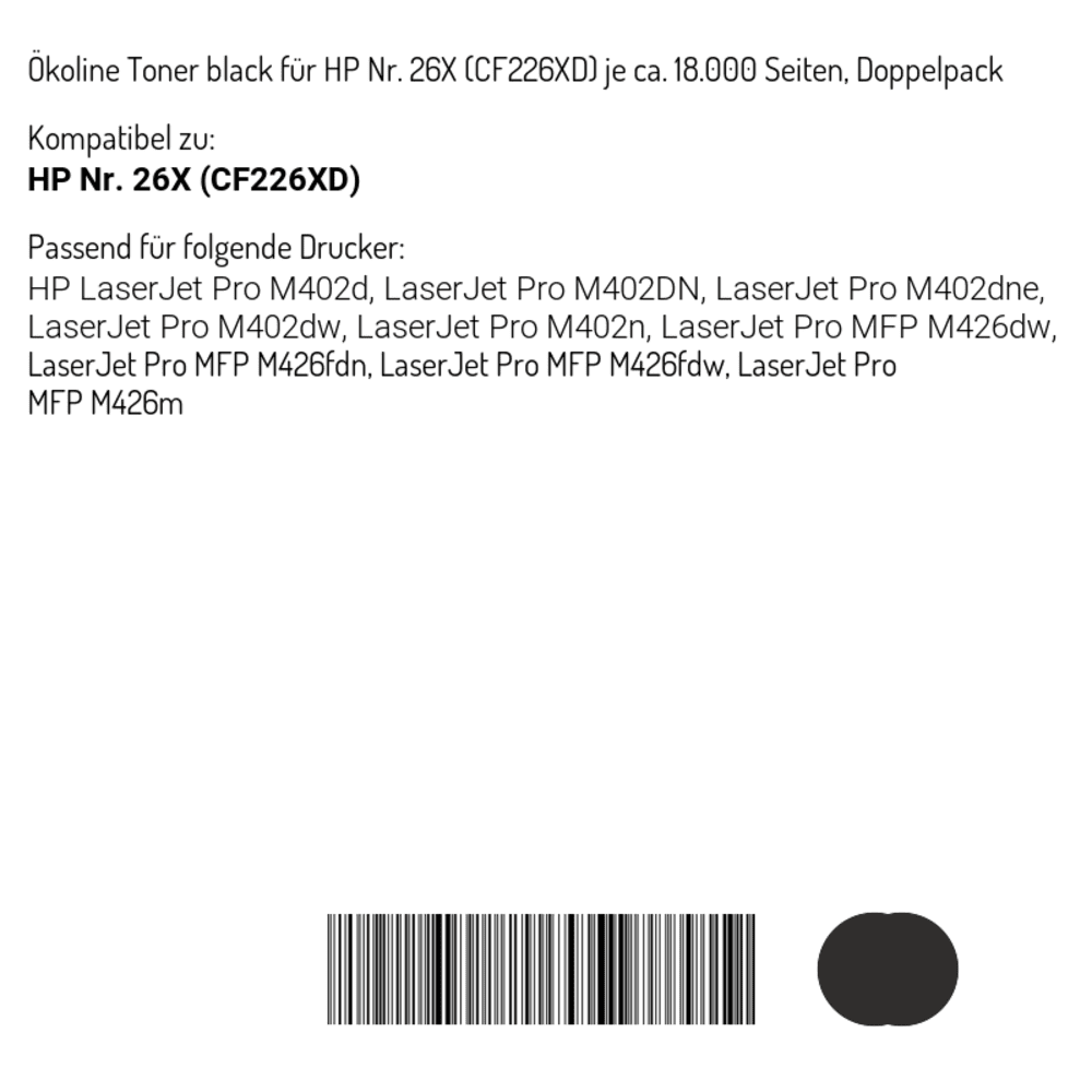 | Kompatibel mit | HP LaserJet Pro M402d, M402dn, M402dne, M402dw, M402m, M402n, MFP M426dw, MFP M426fdn, MFP M426fdw, MFP M426m |